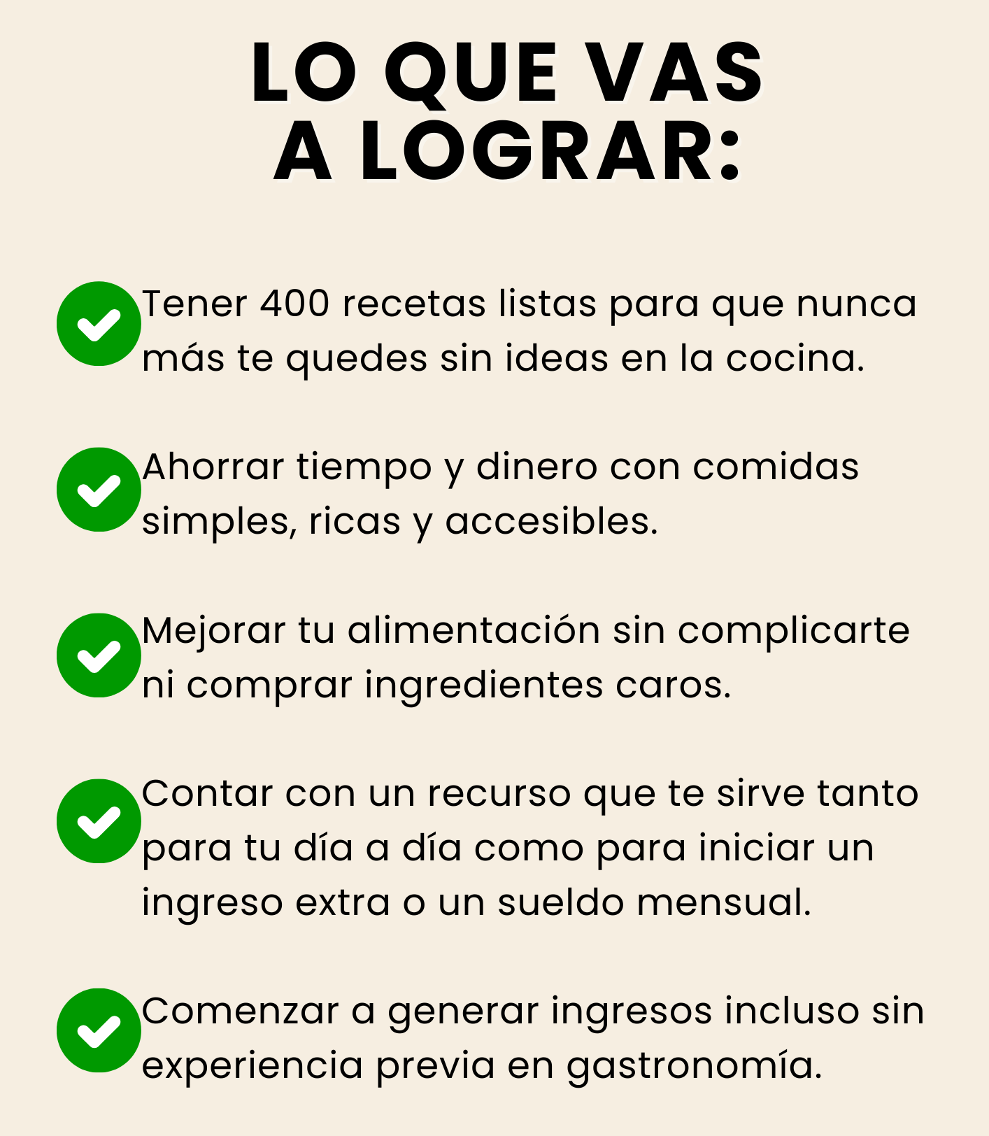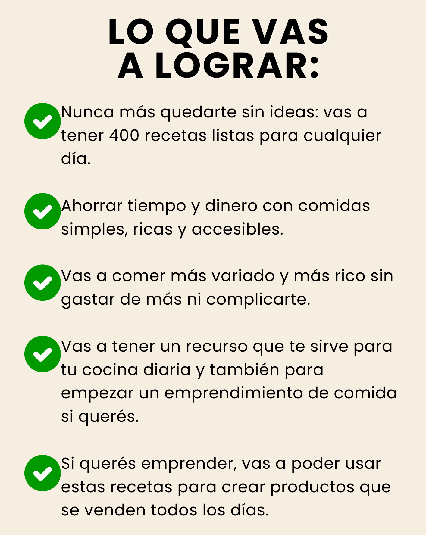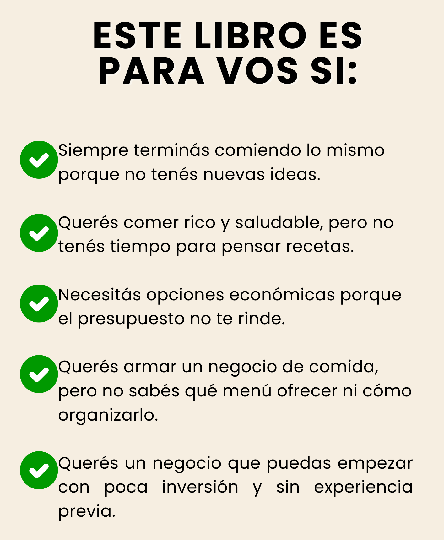 Sí. Los bonos incluidos te explican cómo comenzar desde cero, paso a paso, incluso si jamás vendiste una vianda. Aprendés cómo poner precios, armar menús, organizarte y vender tus primeras unidades con lo que ya tenés en casa. No necesitás experiencia previa: empezás simple y vas creciendo a tu ritmo.